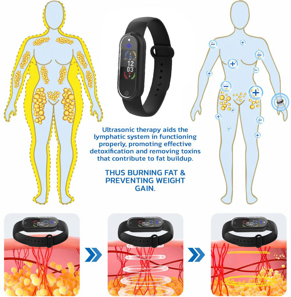 - Fat Blasting and Body Shaping: By emitting continuous ultrasonic waves, the wristband induces fat cell oscillation, rupture, and breakdown. This process effectively targets stubborn fat deposits and cellulite, helping you achieve effortless body sculpting.